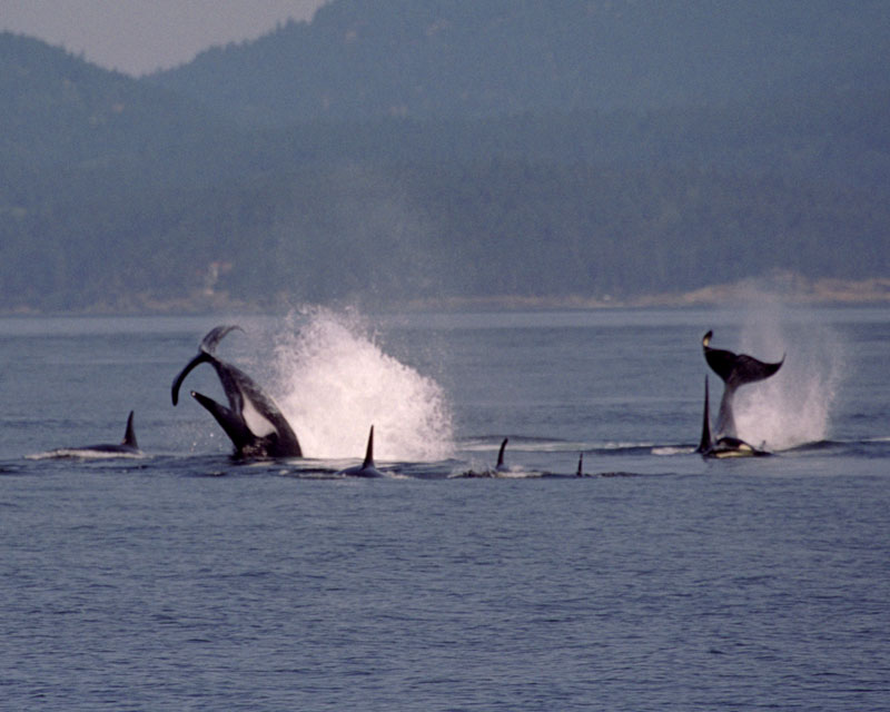 Friday, September 3, 2004: It has been another great week of Whale Watching! On Tuesday, August 31, we saw over 80 Orcas--all three Pods of the Southern Residents--plus a Minke Whale on our way home. On the first day of September, we also had spectacular Whale Watching with lots of close encounters and socialization. The Sea Lions are back for the fall season, and we are seeing them consistently nearly every trip. On Thursday, we had all three pods again on the west shore of San Juan Island, although in the morning at 6:30 a.m., J Pod passed within a mile of our dock in Rosario Straits. Today we had some choices to make as we left the dock. The large group of Whales was west of Race Rocks. Their direction was unknown. We call these Sommer Whales, because some are moving East and some are moving West. With an outgoing tide, we had to assume that they were going to continue in the westerly direction, which would have made a long boat ride and very little Whale Watching (Although we would have gotten there if we decided that was the best thing for the day.) We also had one of the first Humpbacks of the fall season three miles east of Race Rocks. This was our second choice. The Humpback got upstaged by a group of Transient Orcas on the inside of Whidbey Island near Penn Cove. This was a risky game to play, because there would be no other boats on scene, that we knew of, to help us look for these, at times, illusive Whales. Transient Orcas are the race of Orca that feed on Seals, Sea Lions, Porpoises, and yes, other Whales. It is very unique for us to see Transients, so we headed south through Deception Pass and down Saratoga Passage. Captain Matt just called the store informing us that he had found them and was on scene. More details to follow regarding their feeding behavior today.