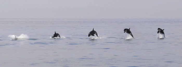 September 30th: We are with all three of the Southern Resident Orca Whale Pods today!! Our guests were also able to see Dall's Porpoises playing in the wake of two boats! Stay tuned to the Whale Report for field reports from our naturalists...Awesome day!! All three pods headed up Swanson Channel. We got some great looks at Faith, L-57, and Nyssa, L-84, and a young one who were all playing together! All the Orca Whales were super playful today and our guests got to see lots of activity. We had Dall's Porpoises bow riding and when we stopped they just stayed around the boat! It was so cool - we got great looks out of and under the water! The Island Whaler's afternoon departure sped to the north into Canadian waters and was with 90 Orca Whales just east of Active Pass! We cruised through the beautiful inner islands after leaving the whales and saw Porpoises, tons of birds, Fallow Deer, Mufont Sheep, and a SPECTACULAR sunset!