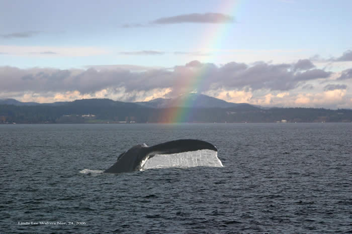 November 24th: Our tour headed west today searching for Humpback and Orca Whales. We had a little wind and rain leaving the dock and conditions steadily improved through the day. We spotted two beautiful, graceful Humpback Whales southwest of Victoria, BC. They were feeding and being flanked by at least 25 Steller’s Sea Lions! One of the Humpbacks was getting fed-up with a persistent Sea Lion, raised his fluke into the air, and walloped the Sea Lion with unbelievable swiftness! The Sea Lion let out a roar that sounded like an elephant screaming in a Tarzan movie and got well clear of the whale! Another highlight of the tour was a magnificent Bald Eagle near Castle Rock! The weather cleared to rainbows, calm seas, and a beautiful sunset!