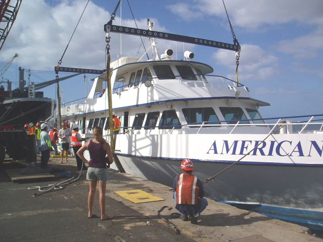 December 10th: Our new boat for the 2007 season, The Island Explorer III, was loaded onto a barge this morning in Hawaii! She's like the Explorer II but a little bigger and a little faster! Stay tuned and watch our progress over the winter as we get her ready for our 2007 whale watching customers!